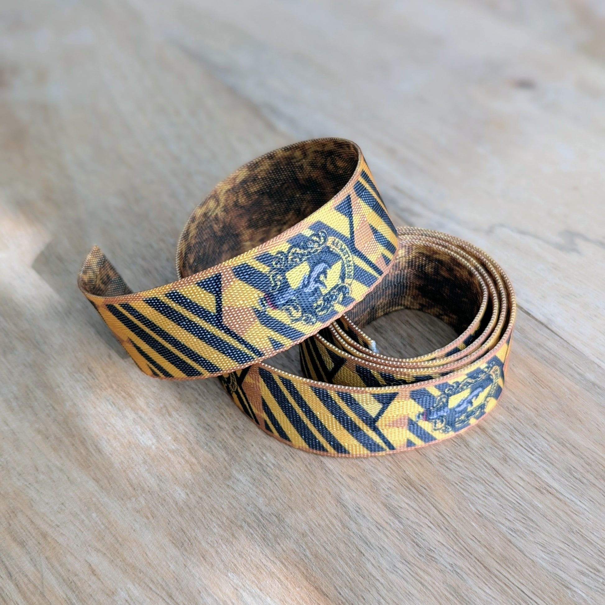 The webbing comes in one continuous cut of 32". Webbing is 1" wide double-sided polyester webbing with fur image on one side and emblem/stripes on the opposing side as shown in the photograph.