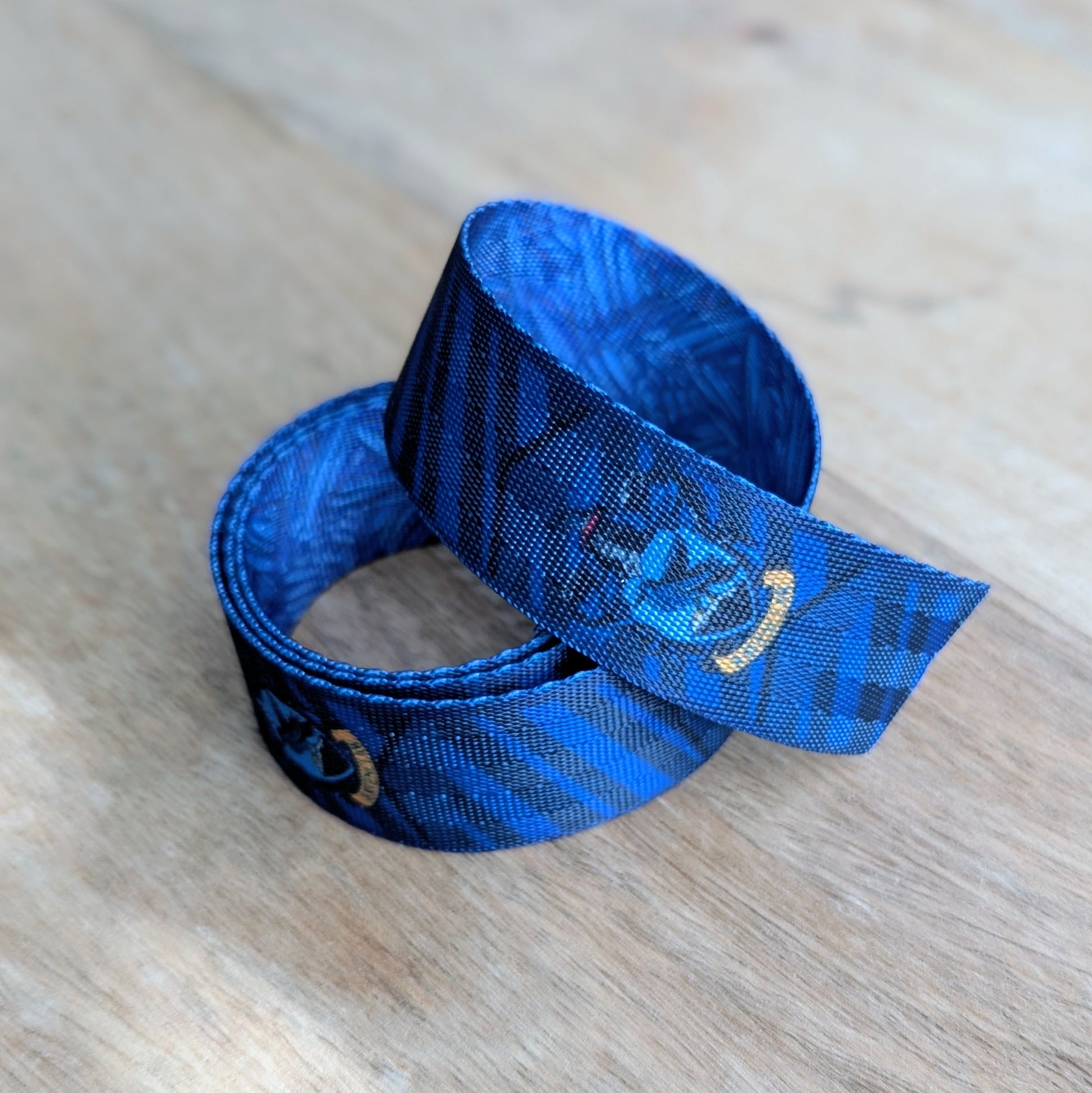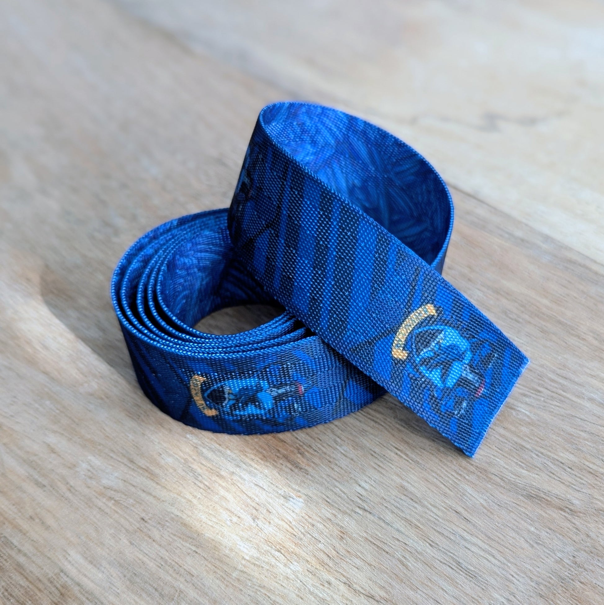 The webbing comes in two continuous cuts of 33" and 27". Webbing is 1" wide double-sided polyester webbing with feather image on one side and emblem/stripes on the opposing side as shown in the photographs.