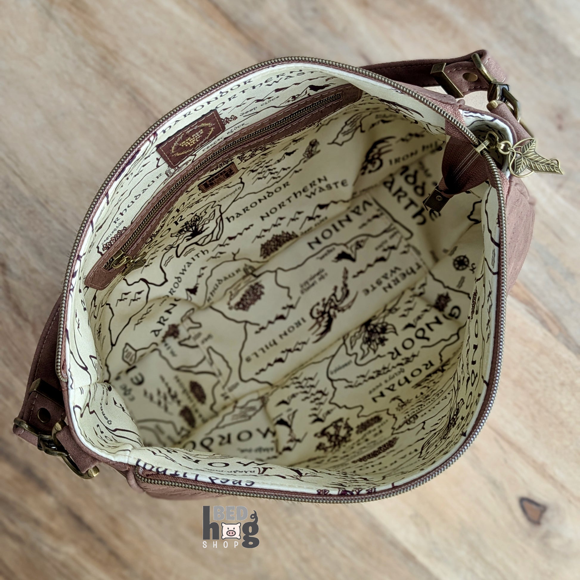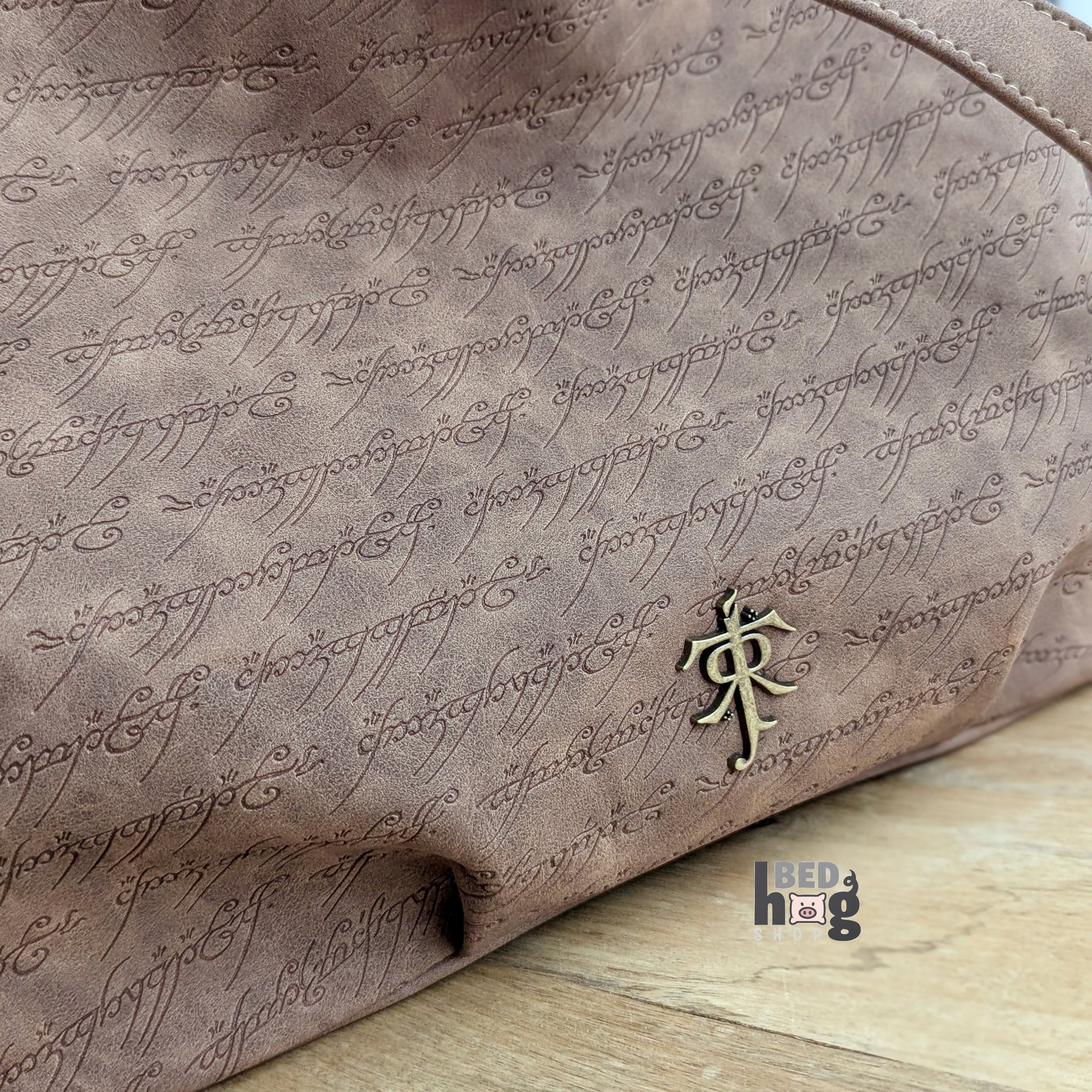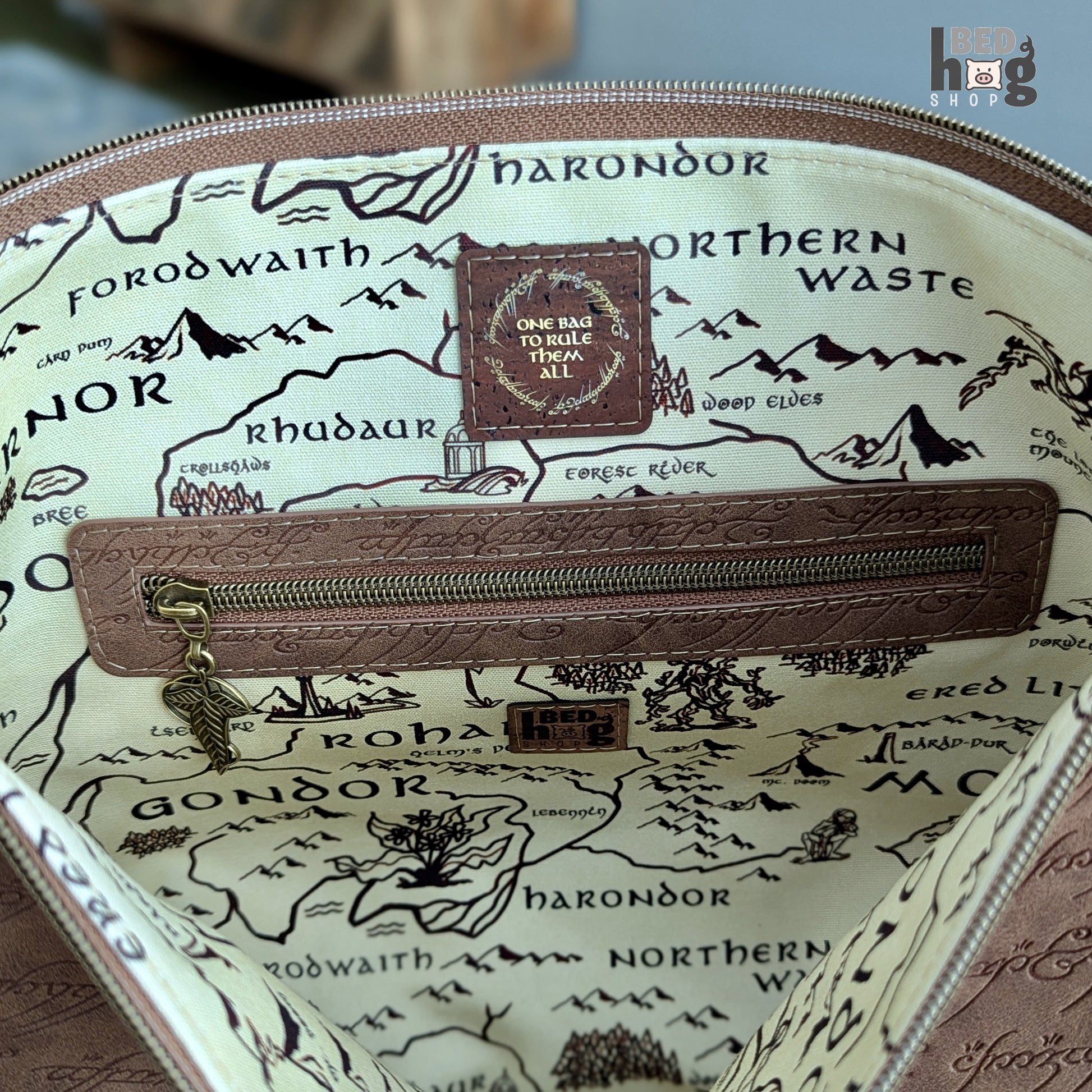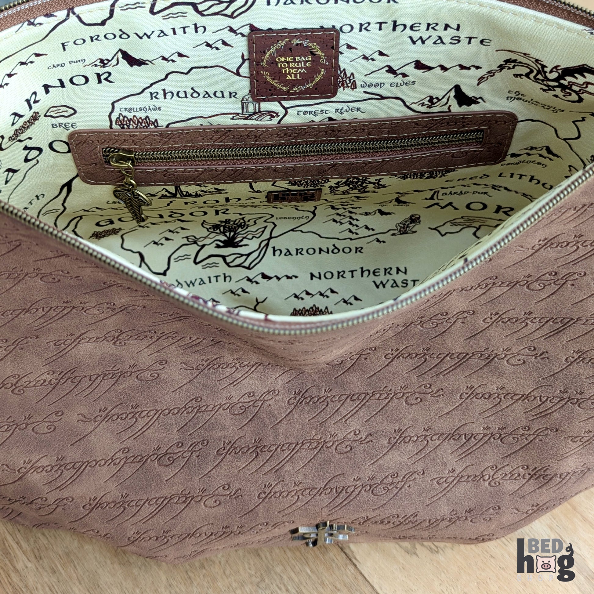 Soft brown faux suede embossed with delicate elvish script, contrasted with a map-print lining and leaf-shaped zipper pulls. A bag that quietly honors history and lore — a companion for tales long remembered, and for adventures yet to come.