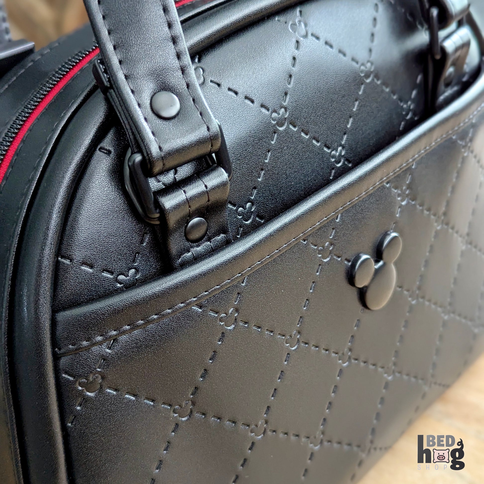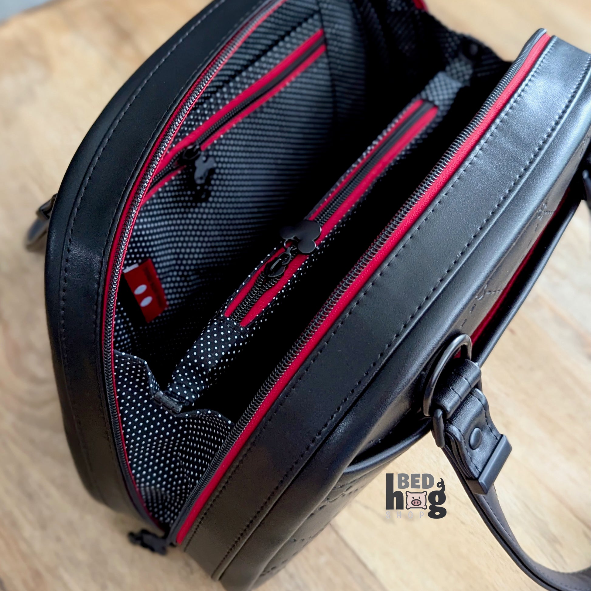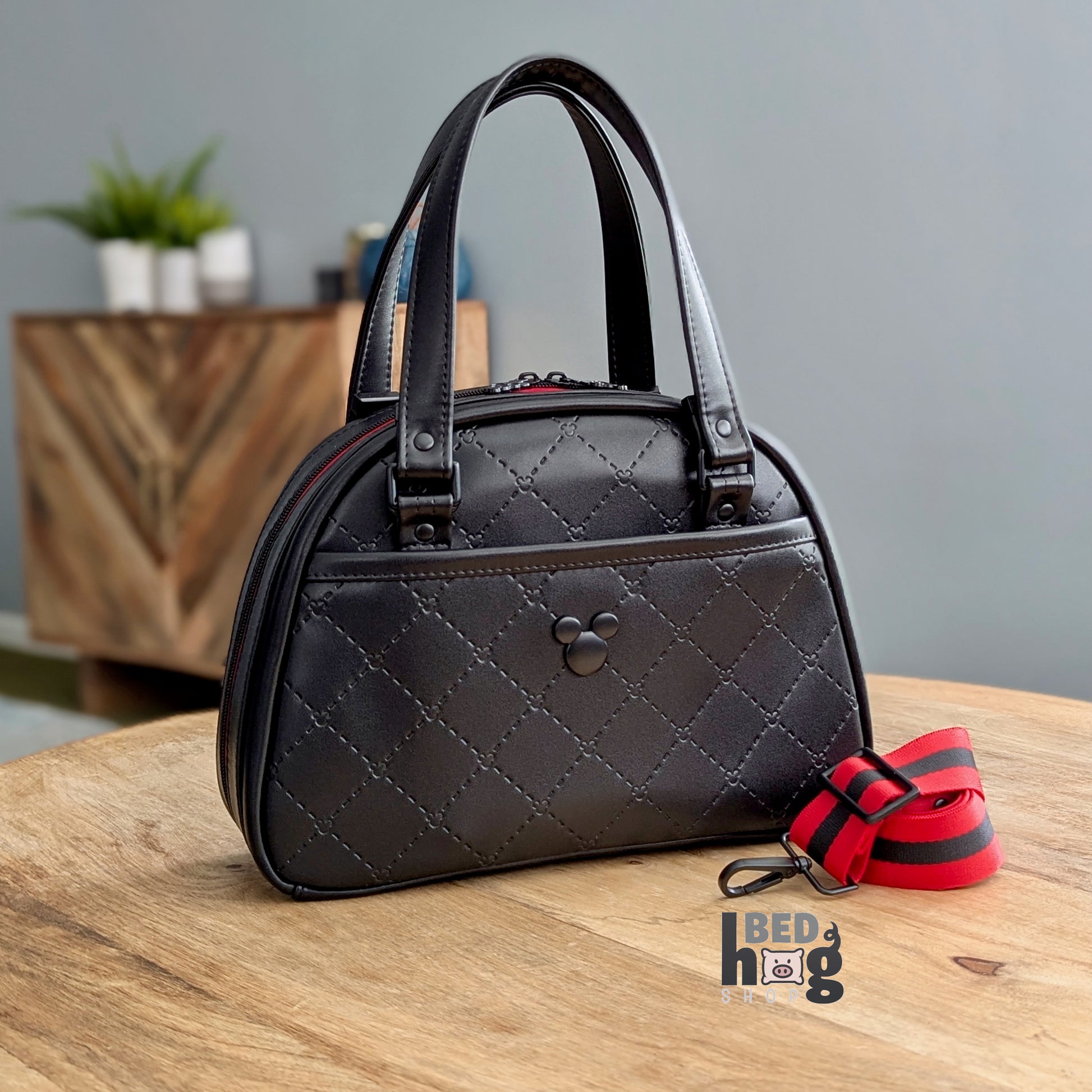 Step into timeless charm with this elegant medium-sized bowler bag, combining a sleek all-black exterior with striking red accents, creating a look that's both classic and bold.